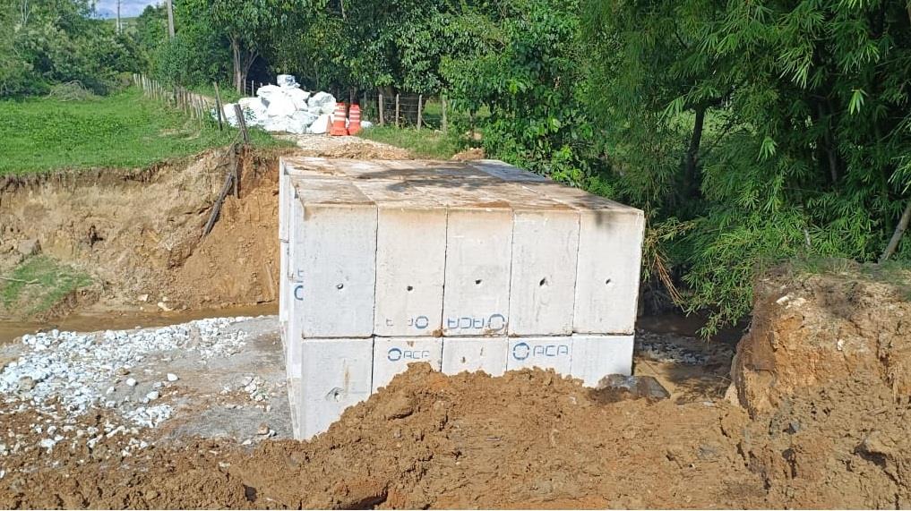 Nesta terça-feira (3) foi iniciada a instalação de aduelas de concreto para a reconstrução de uma ponte localizada em trecho da estrada da Malacacheta, região do bairro Sete Voltas, zona rural de Taubaté.